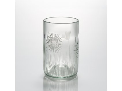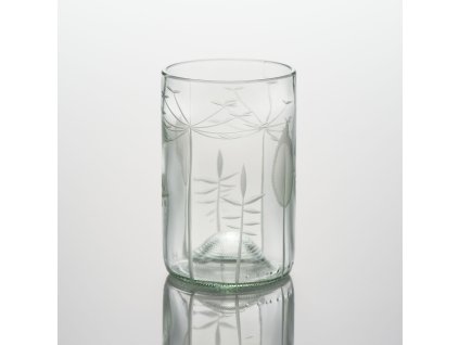 Originální ručně vyráběná sklenice z láhve od minerální vody, s okrajem umně zataveným a s kapradinou šikovně vybroušenou.