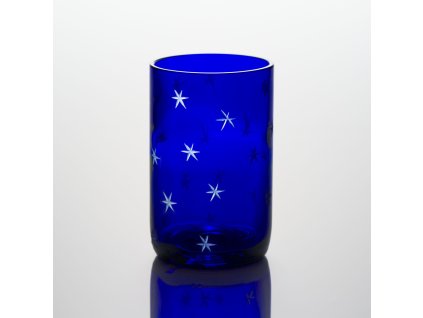 Exkluzivní sklenice s ručně broušeným designem z láhve po minerální vodě, s okrajem pečlivě zataveným a s hvězdami pečlivě vybroušenými.