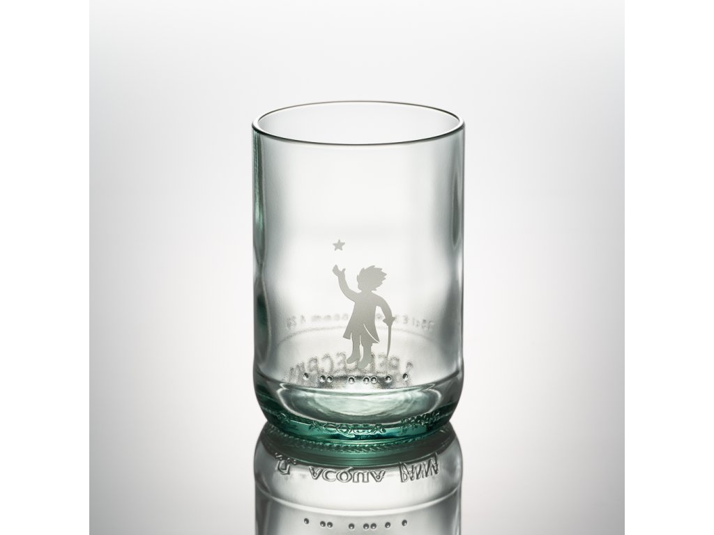 Tato sklenička je vyrobena z láhve od minerálky, která by jinak skončila v odpadu. Prošla složitým procesem záchrany od odstranění etikety, puknutí, několika způsoby broušení, zatavením hrany pomocí plamene, vypískováním motivu Malého prince a vyleštěním. Teď čeká ve skladu a těší se, že místo cesty na skládku může znovu sloužit někomu dalšímu a zdobit jeho domov či práci.