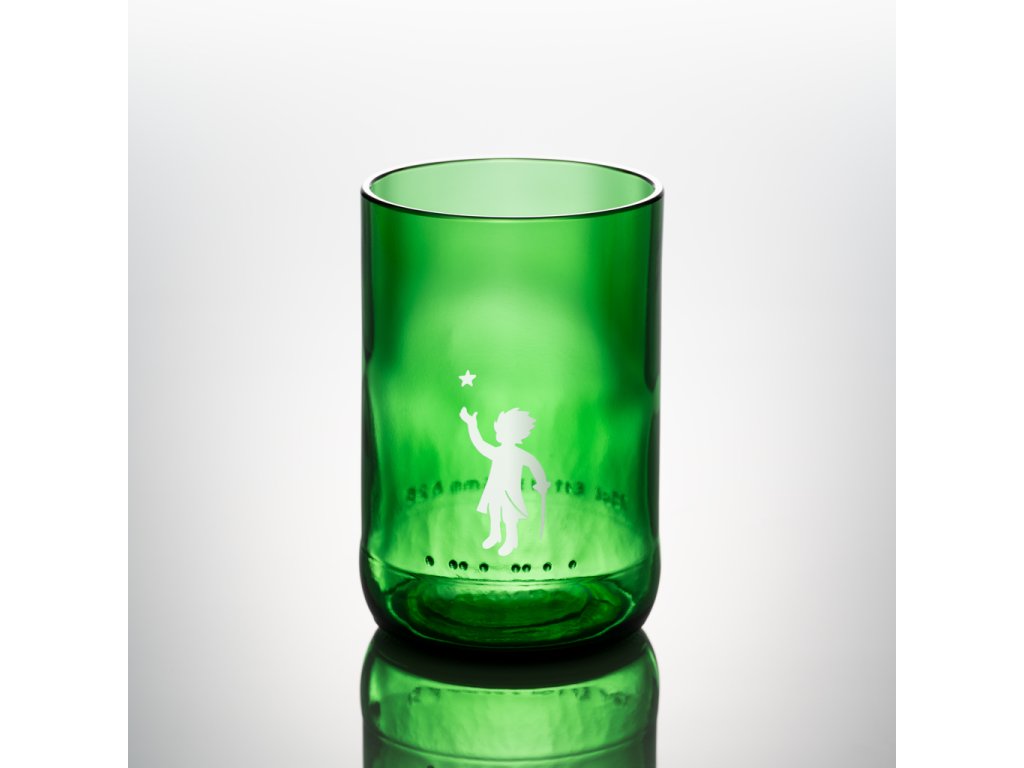 Tato sklenička je vyrobena z láhve, která by jinak skončila v odpadu. Prošla složitým procesem záchrany od odstranění etikety, puknutí, několika způsoby broušení, zatavením hrany pomocí plamene, vypískováním motivu Malého prince a vyleštěním. Teď čeká ve skladu a těší se, že místo cesty na skládku může znovu sloužit někomu dalšímu a zdobit jeho domov či práci.