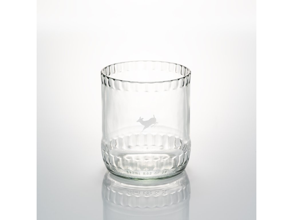 Tato sklenička je vyrobena ze zavařovačky, která by jinak skončila v odpadu. Prošla složitým procesem záchrany od odstranění etikety, puknutí, několika způsoby broušení, zatavením hrany pomocí plamene, vypískováním srnky a vyleštěním. Teď čeká ve skladu a těší se, že místo cesty na skládku může znovu sloužit někomu dalšímu a zdobit jeho domov či práci.